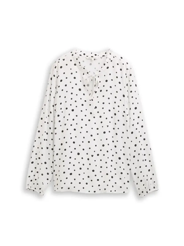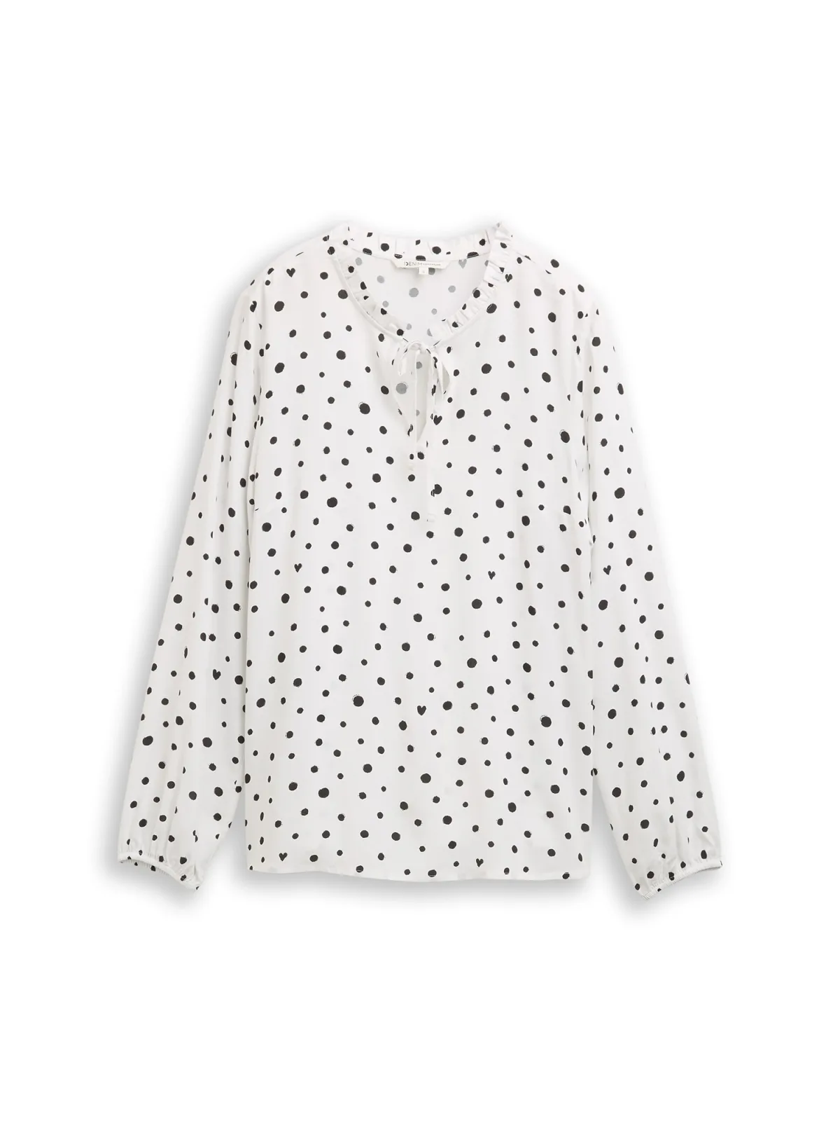 Damesblouse met lange mouwen van Tom Tailor Denim;Look: effen;Pasvorm: Regular fit ;Kraagmodel: Kraag met ruches;Motief: gestippeld;Applicatie: Labelstitching;Hals: Druppelvormige cut-out;Sluiting: Houtje-touwtjesluiting;Mouwvorm: lange mouwen;Mouwboord: elastisch;Rompzoom: afgerond;Materiaal: pure viscose
