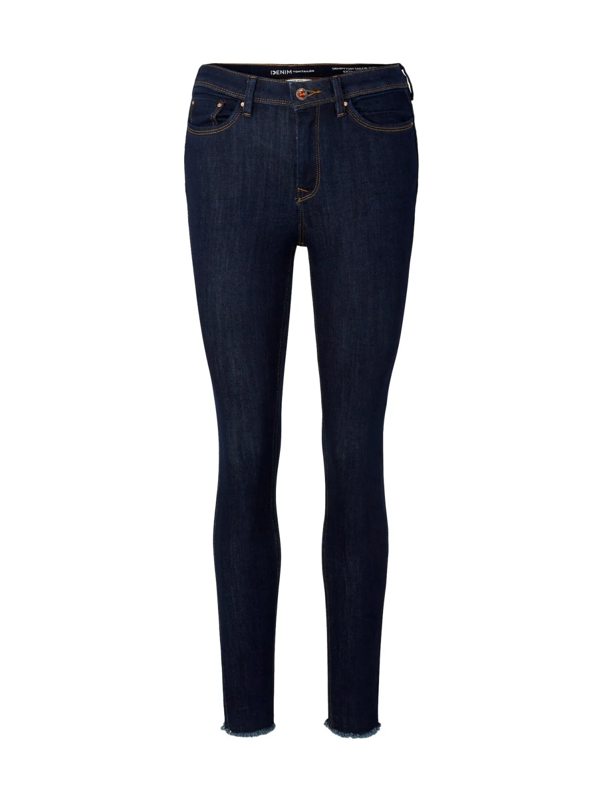 Design: Gefranjerde zoom, Ritssluiting, 5-pocket-style; Type sluiting: Ritssluiting; Materiaal: Denim; Motief: Effen; Details: Franjes; Extra's: Studs, Contrasterende naden, Riemlussen; Wassing: Rinsed/dark washed; Lengte: 7/8 lengte; Pasvorm: Skinny; Taillehoogte: Mid waist