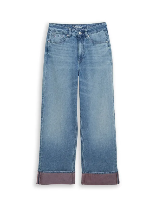 Design: Omgeslagen zoom, 5-pocket-style; Type sluiting: Ritssluiting; Materiaal: Denim; Motief: Effen; Extra’s: Studs; Wassing: Light washed; Lengte: Lang/maxi; Pasvorm: Wide leg; Taillehoogte: High waist