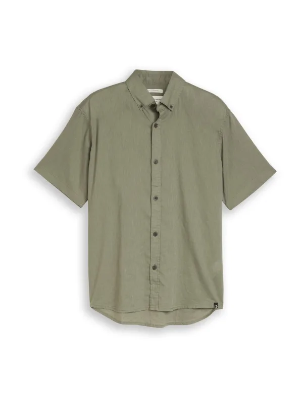 Heren vrijetijdsoverhemd van Tom Tailor Denim;look: effen;Pasvorm: relaxed fit;overhemdkraag: button-downkraag;Knoopsluiting: doorlopend;Applicatie: labelpatch;mouwvorm: korte mouw;materiaalverwerking: gevlamd garen;Materiaal: mix van katoen en linnen