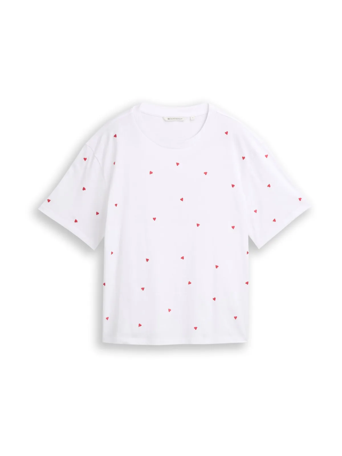 Dames T-shirt van Tom Tailor Denim;Look: effen;Pasvorm: Boxy fit;Applicatie: allover-hartborduursel;Hals: ronde hals;Mouwvorm: korte mouw;Rompzoom: met zijsplitten;Materiaal: puur katoen