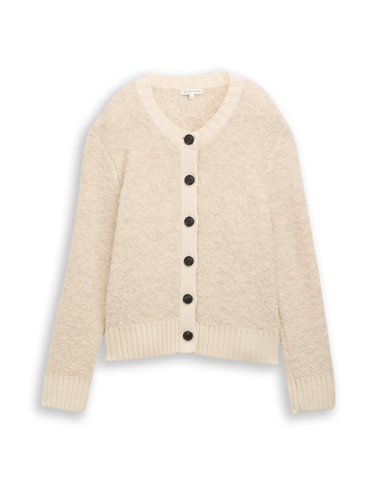 Design: Geribbelde kraag, Knop placket, Geribd ceintuurtje; Type sluiting: Knoopsluiting; Materiaal: Bouclé; Halstype: Ronde hals; Motief: Effen; Extra's: Fully fashioned, Voelt zacht aan; Pasvorm: Normale pasvorm; Armlengte: Lange mouw; Lengte: Normale lengte