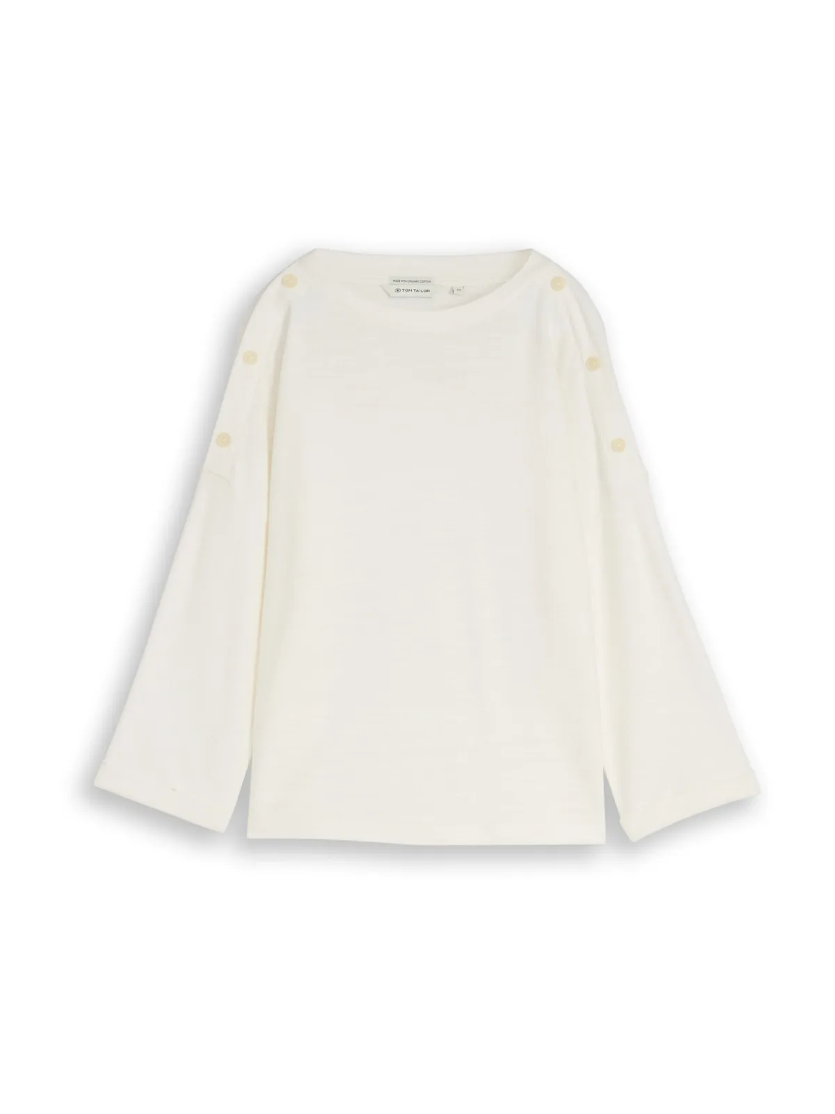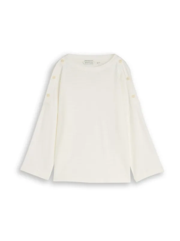 dames 3/4-shirt van Tom Tailor;look: effen;Pasvorm: loose fit;Details: schouderknopen;hals: boothals;mouwvorm: 3/4-mouw;Mouwboord: gefixeerde omslag;materiaalverwerking: piqué;Materiaal: mix van katoen met katoen en modal