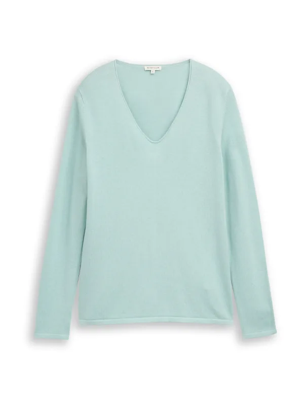 Damespullover van Tom Tailor;Look: effen;Pasvorm: Regular fit;Hals: V-hals;Mouwvorm: lange mouwen;Mouwboord: geribd;Rompzoom: geribd;Materiaalverwerking: Fijnrib, geribd;Materiaal: Katoen- en viscosemix