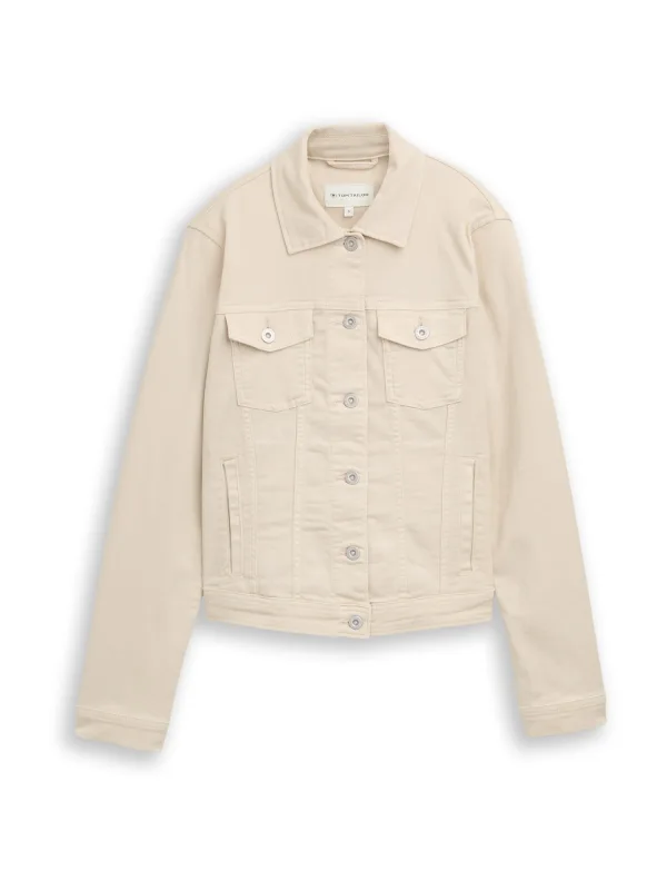 Dames jeansjack van Tom Tailor;look: effen;Pasvorm: regular fit;kraagmodel: platte kraag;Sluiting: enkelrijige knoopsluiting;applicatie: labelapplicatie;Mouwvorm: lange mouw;mouwboord: Knoop;rompzoom: taillebandje;Zakken: borstzakken, zij-steekzakken;materiaalverwerking: denim;Materiaal: katoenmix