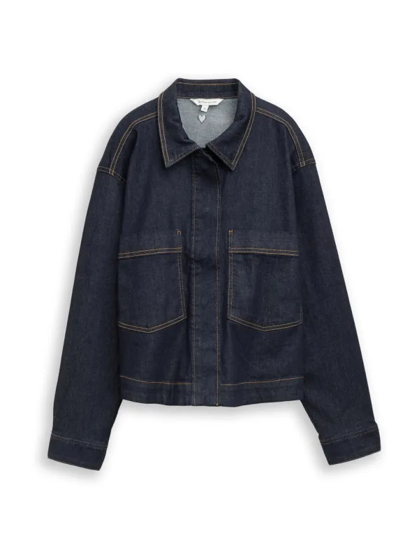 dames jeansjack van Tom Tailor;Look: Denim;Pasvorm: regular fit;Kraagmodel: Platte kraag;Sluiting: enkelrijige drukknoopsluiting;Applicatie: stitchingmotief;Details: schouderpas achterzijde;Mouwvorm: lange mouw;mouwboord: manchet;Zakken: borstzakken;Materiaalverwerking: twill;Materiaal: Katoenmix
