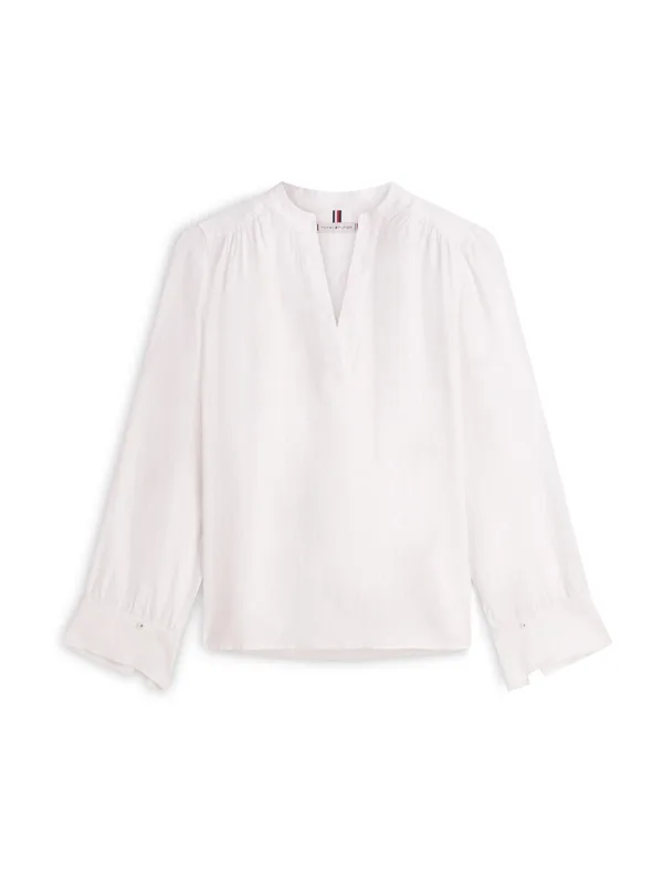 dames linnen blouse van Tommy Hilfiger;look: effen;Pasvorm: relaxed fit;kraagmodel: tuniek;applicatie: logodetail;Details: achterpas;hals: V-hals;Mouwvorm: lange mouw;mouwboord: manchet;materiaalverwerking: gevlamd garen;Materiaal: puur linnen