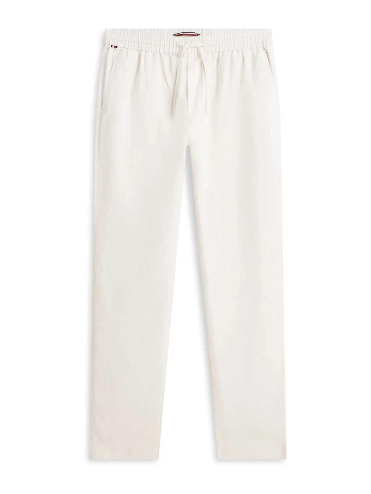 heren chino van Tommy Hilfiger;Model 'Harlem';look: effen kleuren;Pasvorm: tapered;Applicatie: gestikt logo;boord: tunnelkoord;Zakken: zij- steekzakken, paspelzakken;Materiaal: linnenmix
