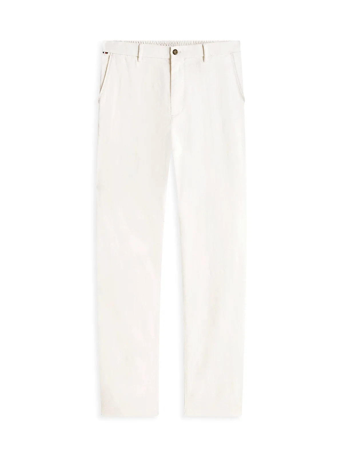 heren linnen broek van Tommy Hilfiger;Model 'denton Sorona';look: effen;pasvorm: slim fit;pasvorm volgens de fabrikant: slim straight;Applicatie: gestikt logo;Details: riemlussen;Sluiting: knoop en verborgen ritssluiting;boord: elastisch;Zakken: zij- steekzakken, achterzakken;Materiaal: linnenmix