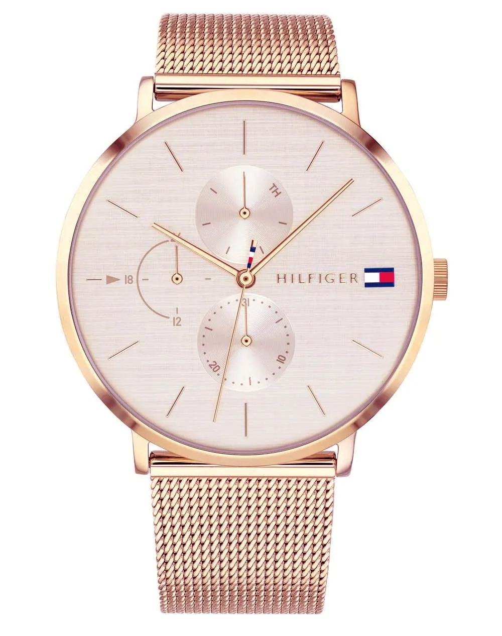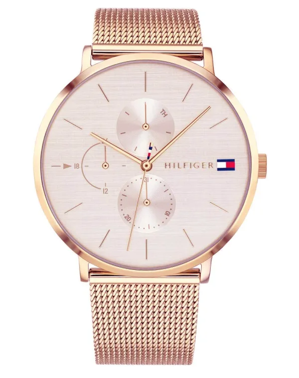 Deze Tommy Hilfiger Jenna Multi Dial Horloge voor Dames is het perfecte tijdpiece om te dragen of als cadeau. De roségouden 40 mm ronde kast in combinatie met het comfortabele roségouden roestvrij staal zorgt ervoor dat je van dit prachtige horloge kunt genieten zonder concessies te doen. Aangedreven door een hoogwaardige kwartsbeweging en waterbestendig tot 3 bar, blijft je horloge tikken. Dit horloge is geschikt voor elke gelegenheid, of je nu aan het werk bent, in je vrije tijd of op een feest. - Het horloge heeft een kalenderfunctie: Dag-Datum, 24-uursweergave. Hoogwaardige 19 cm lengte en 19 mm breedte roségouden roestvrijstalen band met een vouwsluiting. Kastdiameter: 40 mm, kastdikte: 8 mm, kastkleur: Ip-rosé en wijzerplaatkleur: roségoud.