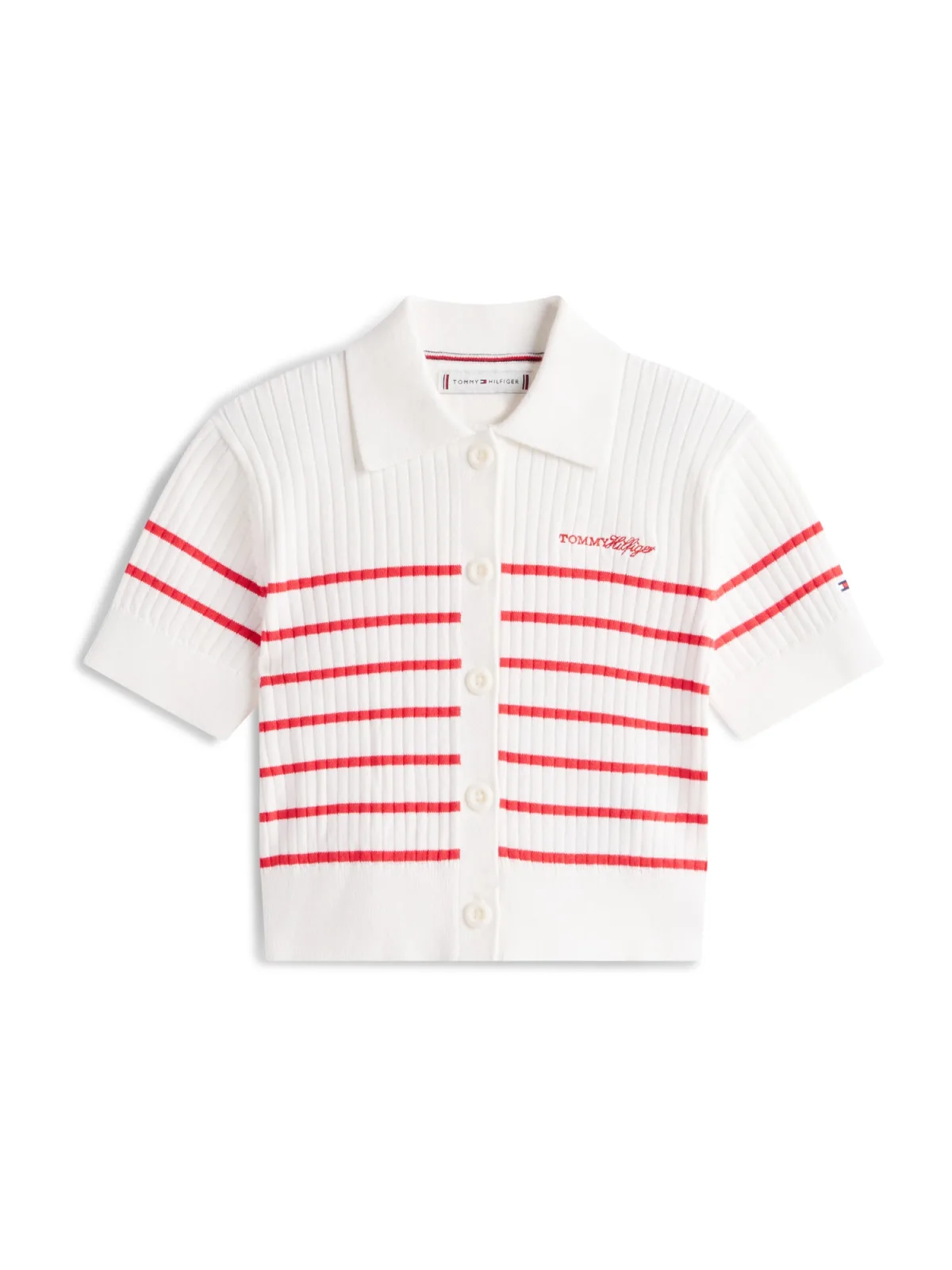 Design: Rechte zoom, Knop placket, Geribd ceintuurtje, Geribbeld gebreid, Turn-down kraag; Type sluiting: Knoopsluiting; Materiaal: Knitwear; Halstype: Polokraag; Motief: Gestreept; Details: Borduursels; Extra's: All-over patroon, Label borduurwerk, Voelt zacht aan; Pasvorm: Slanke pasvorm; Armlengte: Kwartmouw; Lengte: Korte pasvorm