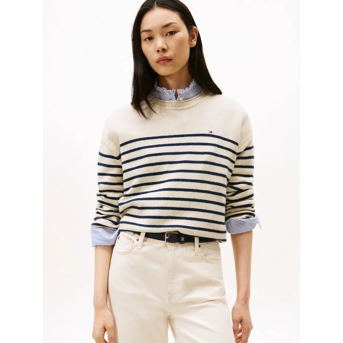 Gebreide damestrui van Tommy Hilfiger;Look: All-over motief;Pasvorm: Regular fit ;Motief: gestreept;Applicatie: Gestikt logo;Hals: ronde hals;Mouwvorm: lange mouwen;Mouwboord: Rolzoom;Rompzoom: geribd;Materiaalverwerking: Knitwear;Materiaal: zuivere wol