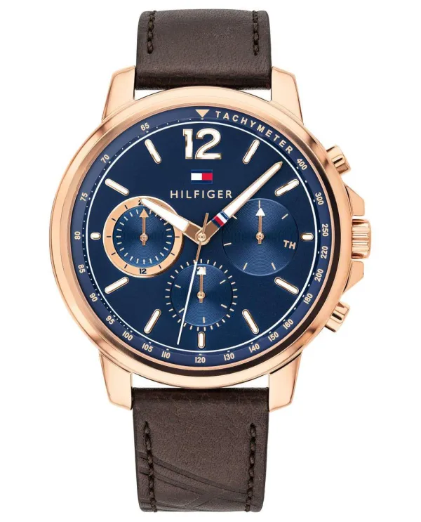 Deze Tommy Hilfiger Landon Multi Dial Horloge voor Mannen is het perfecte tijdstuk om te dragen of als cadeau te geven. De rosegouden 44 mm ronde kast in combinatie met het comfortabele bruine leer zorgt ervoor dat je zonder compromissen van dit verbluffende horloge kunt genieten. Aangedreven door een hoogwaardig quartz-uurwerk en waterbestendig tot 5 bar, blijft je horloge tikken. Stijlvol, sportief en een modern ontwerp, zeer geschikt voor mannen. Het horloge heeft een kalenderfunctie: Dag-Datum, een 24-uursweergave, Tachymeter. Hoogwaardige bruine leren band van 22 cm lang en 18 mm breed met een gesp. Kastdiameter: 44 mm, kastdikte: 10 mm, kastkleur: Ip-roze en wijzerplaatkleur: Blauw.