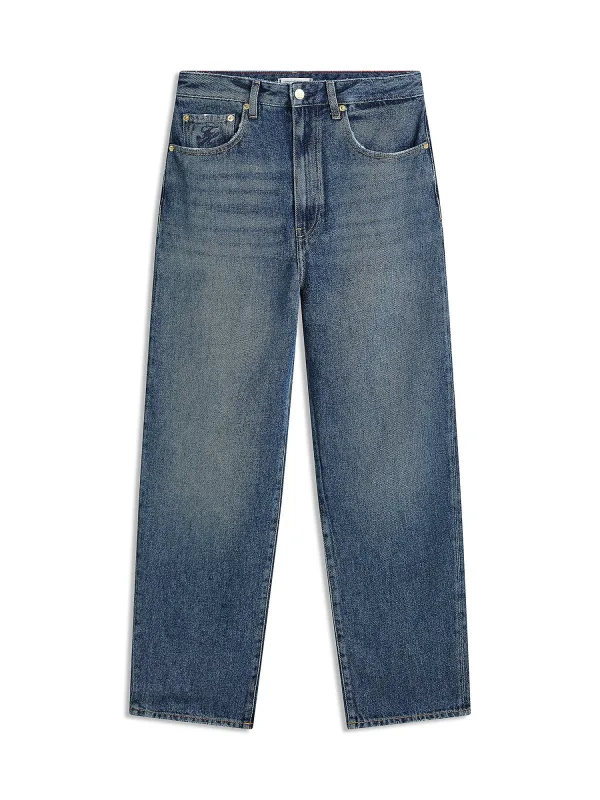 Design: Gevoerde zoom/rand, Placket, 5-pocket-style, Zakken aan de zijkant; Materiaal: Denim; Motief: Effen; Extra's: Contrasterende naden, Riemlussen; Wassing: Heavy washed; Lengte: Lang/maxi; Pasvorm: Vat; Taillehoogte: Mid waist