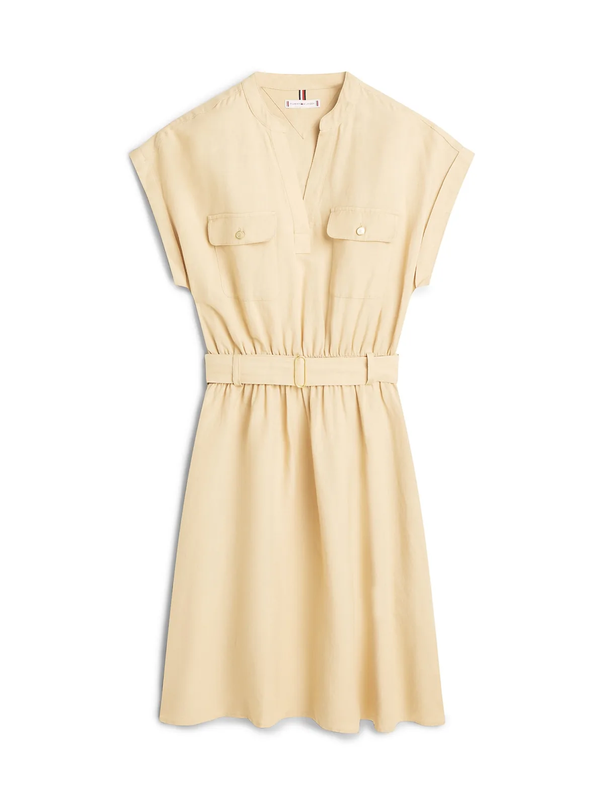 Design: Gevoerde zoom/rand; Materiaal: Linnen; Halstype: Uitgesneden hals; Motief: Effen; Details: Gedrapeerd; Extra's: Op staal naden; Lengte: Knielengte; Snit: Getailleerd; Pasvorm: Losse pasvorm; Armlengte: Kwartmouw