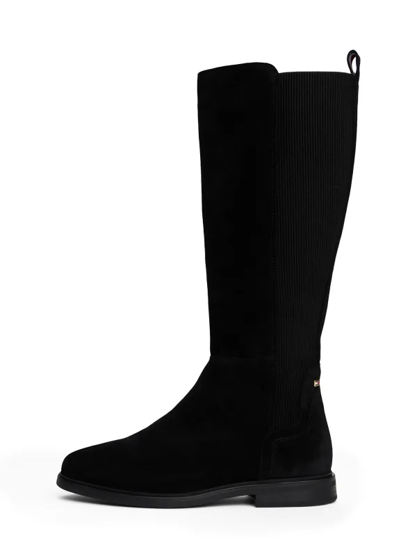 Dameslaarzen van Tommy Hilfiger;Look: effen;Punt van de schoen: afgerond;Hakvorm: plat;Applicatie, elastische inzet;Details: Logo-applicatie;Sluiting: Ritssluiting;Zool: gestructureerd;Materiaalverwerking: velours;materiaal: echt leder;Hakhoogte bij maat 40: 2 cm;Schachthoogte bij maat 40: 38 cm;Schachtbreedte bij maat 40: 10 cm