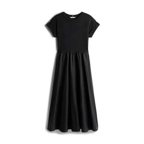 Midi-jurk van Tommy Hilfiger;Look: effen;Pasvorm: Fit and Flare;Lengte: Midi;Hals: ronde hals;Applicatie: Logodetail;Details: Knopen, extra brede schouders;Mouwvorm: korte mouwen;Bijzondere kenmerken: Bovendeel van fijnrib;Materiaal: Katoenmix;Totale lengte bij maat S: 129 cm;Borstomvang bij maat 36: 54 cm;Schouderbreedte bij maat 36: 48 cm;Mouwlengte bij maat 36: 9 cm