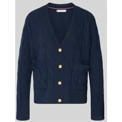 Gebreid damesjack van Tommy Hilfiger;Look: effen/gestructureerd;Pasvorm: Oversized;Sluiting: enkele knoopsluiting;Applicatie: Gestikt logo;Details: extra brede schouders;Hals: V-hals;Mouwvorm: lange mouwen;Mouwboord: geribd;Rompzoom: geribd;Zakken: opgestikte steekzakken;Materiaalverwerking: Knitwear;Materiaal: zuivere wol;Ruglengte bij maat S: 59 cm;Borstomvang bij maat S: 60 cm;Mouwlengte bij maat S: 48 cm