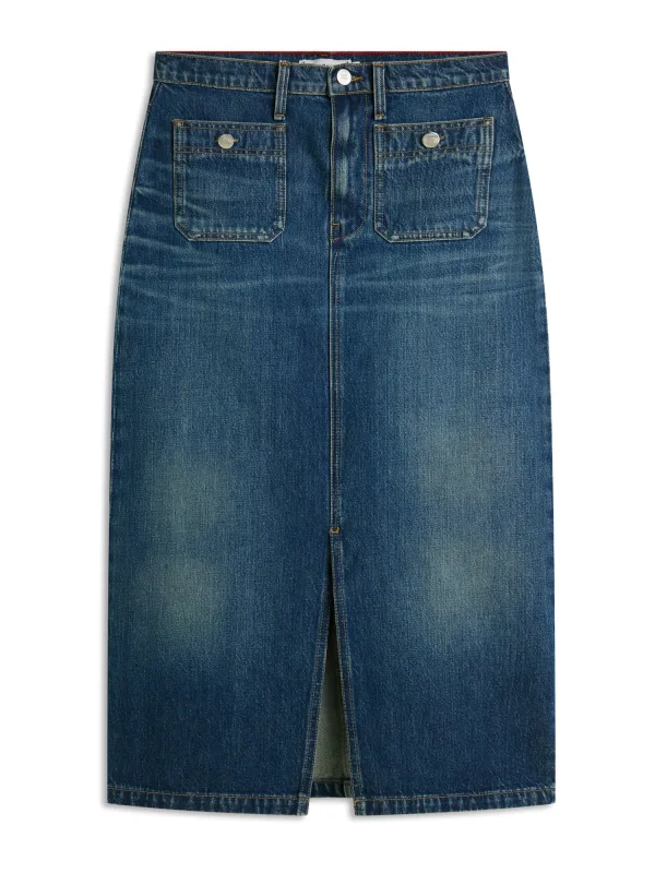 Design: Split, Ritssluiting, Opgezette zakken, Achterzak; Type sluiting: Ritssluiting; Materiaal: Denim; Motief: Effen; Rokvorm: Kokerrok; Extra's: Contrasterende naden, Label patch/label flag, Gewassen effect, Vaste grip, Riemlussen; Lengte: 3/4 lengte; Pasvorm: Normale pasvorm