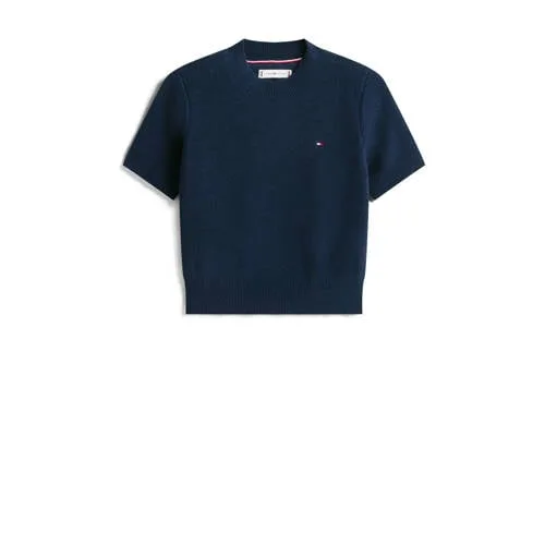 Deze Tommy Hilfiger sweater heeft korte mouwen en een ronde hals. De sweater is gemaakt van 100% polyester. Met rechte mouwen en een chenille look draag je deze makkelijk op een rok of jeans.