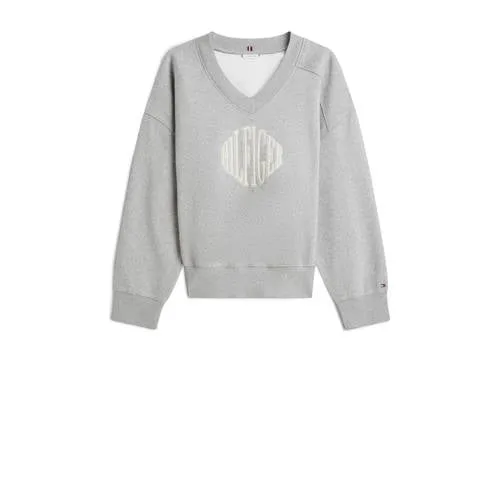 Deze Tommy Hilfiger trui voor dames heeft rechte mouwen en een V-hals. De trui is gemaakt van katoen en polyester, heeft een logo op de voorkant, borduursels en geribde boorden.