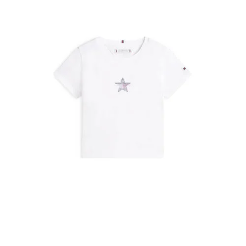 Dit witte Tommy Hilfiger meisjes T-shirt is een fijne basic met een subtiel opvallend detail. Het T-shirt heeft een ronde hals en korte, rechte mouwen, waardoor het gemakkelijk te combineren is met jeans, een rok of een short. De zachte katoenmix met elastaan zorgt voor een soepele fit die prettig meebeweegt tijdens het spelen of naar school gaan. De strass steentjes op de print geven het shirt een speelse glans.Kenmerken die elke dag passen Gemaakt van 93% katoen en 7% elastaan voor een zacht en licht elastisch gevoel Korte mouwen met rechte inzet voor een tijdloze pasvorm Witte kleur met printopdruk en strass steentjes als glinsterend detail Ronde hals die comfortabel afsluit zonder te knellen Per stuk verpakt, handig als favoriete basic in de kast Geen zakken voor een rustige uitstralingElke dag eenvoudig te stylenDit T-shirt past net zo makkelijk bij een sportieve outfit als bij een meer geklede look. Het lichte materiaal voelt prettig op de huid, ook tijdens langere dagen. Ideaal voor school, een verjaardag of een dagje weg, gecombineerd met een vest, denim jack of gewoon zo gedragen.Tommy Hilfiger voor kidsTommy Hilfiger staat bekend om herkenbare, frisse designs met aandacht voor detail. De kindercollecties sluiten aan op de stijl van het merk, maar zijn afgestemd op het dagelijkse leven van kinderen. Je kiest voor kleding die er verzorgd uitziet en geschikt is voor veelvuldig gebruik.Een stijlvolle basic met een subtiele glans, klaar voor elke dag.