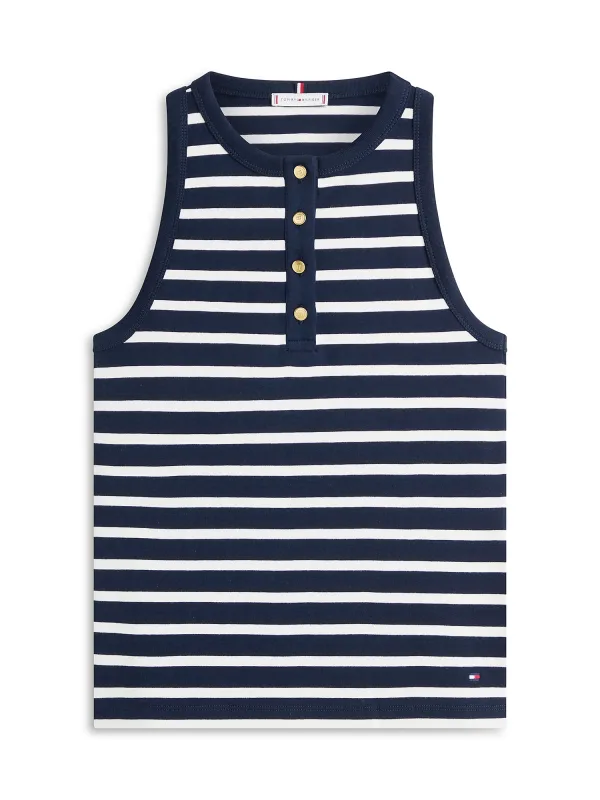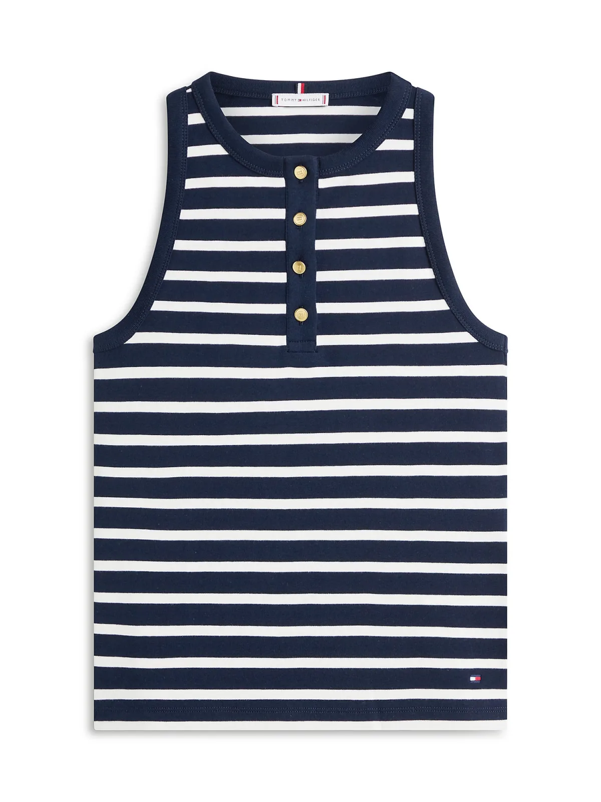 Design: Gevoerde zoom/rand, Rechte zoom, Knop placket; Materiaal: Jersey; Halstype: Henley hals; Motief: Gestreept; Soort bandjes: Normale bandjes; Extra's: All-over patroon, Voelt zacht aan; Pasvorm: Normale pasvorm; Armlengte: Mouwloos; Lengte: Normale lengte