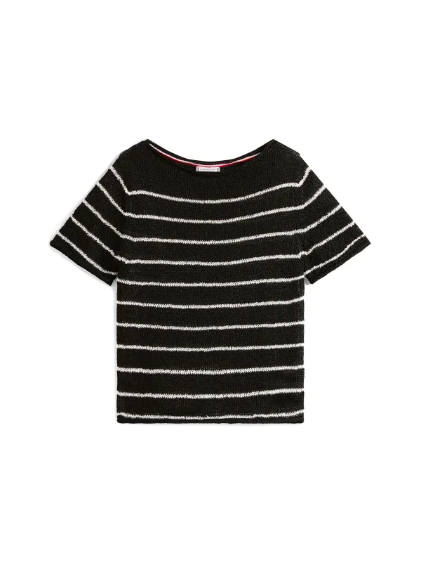 Design: Rechte zoom, Geribbeld gebreid; Materiaal: Knitwear; Halstype: Ronde hals; Motief: Gestreept; Extra's: Fully fashioned, Met textuur; Pasvorm: Normale pasvorm; Armlengte: Kwartmouw; Lengte: Normale lengte