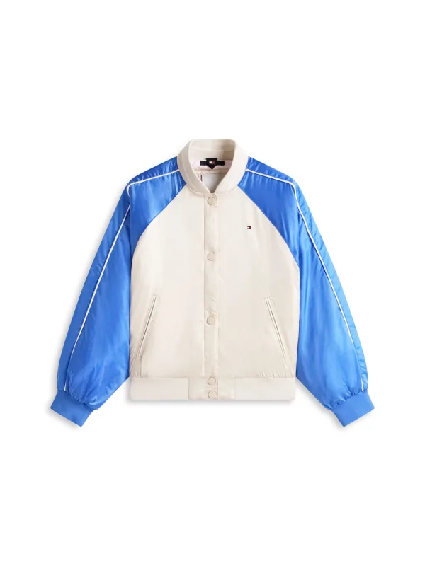 Deze Tommy Hilfiger meisjes bomberjas voor de zomer is een lichte en comfortabele jas voor frisse dagen en avonden. De combinatie van ecru met hardblauw geeft een sportieve, moderne look die makkelijk te combineren is met jurken, jeans of shorts. De voering zorgt voor net wat extra warmte, zonder dat de jas zwaar aanvoelt, ideaal voor het tussenseizoen en koele zomerdagen.Zomerse bomberstijl met praktische details Geschikt als zomerjas, perfect voor milde temperaturen en wisselvallig weer. Bombermodel met ronde hals, voor een eigentijdse en sportieve uitstraling. Ecru met hardblauwe accenten, een kleurcombinatie die goed past bij veel outfits. Lange mouwen en gevoerde binnenkant voor extra draagcomfort. Handige drukknopen aan de voorkant, waardoor de jas snel open en dicht gaat. Voorzien van zakken aan de voorkant, fijn voor kleine spulletjes of om handen in te warmen.Elke dag makkelijk aan en uitDeze meisjesjas is gemaakt voor dagelijks gebruik, van school tot speelplaats. De drukknopen zijn ook voor kleine handen eenvoudig te bedienen en de lichte voering maakt de jas geschikt om het hele zomerseizoen te dragen.Tommy Hilfiger: herkenbare stijlTommy Hilfiger staat bekend om een duidelijke, sportieve signatuur met herkenbare kleurencombinaties. De collectie voor kinderen sluit aan op dezelfde stijl als bij de volwassenlijnen, met aandacht voor draagcomfort en betrouwbare kwaliteit.Een veelzijdige zomerjas die meegaat in het dagelijkse ritme en er elke keer verzorgd uitziet.
