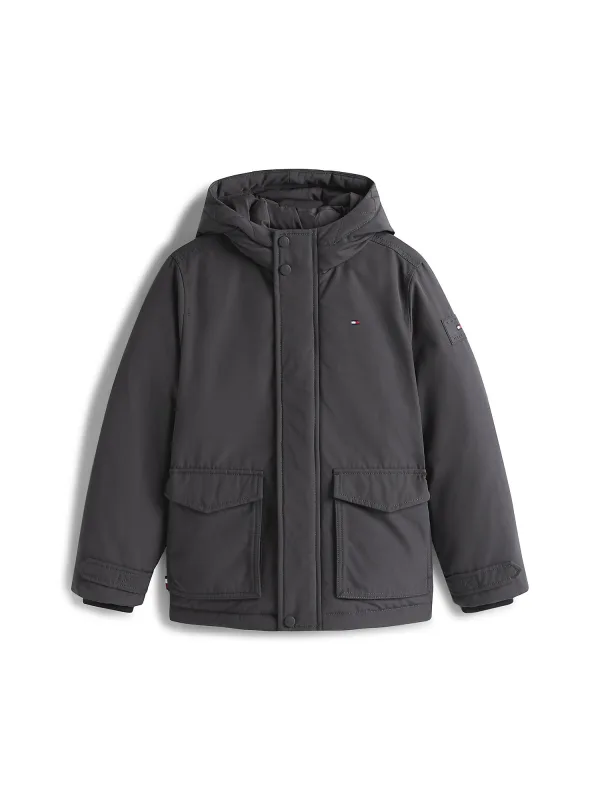 Kinderparka van Tommy Hilfiger Teens;Look: effen;Pasvorm: Regular fit;Kraagmodel: Capuchon;Sluiting: blinde tweewegsritssluiting, drukknopen;Applicatie: Labelpatch, logostitching, logo-applicatie;Mouwvorm: lange mouwen;Mouwboord: Binnenmanchetten;Zakken: Binnenzak, klepzakken;Ruglengte bij maat 152: 67 cm;Borstomvang bij maat 152: 54 cm;Schouderbreedte bij maat 152: 40 cm;Mouwlengte bij maat 152: 55 cm