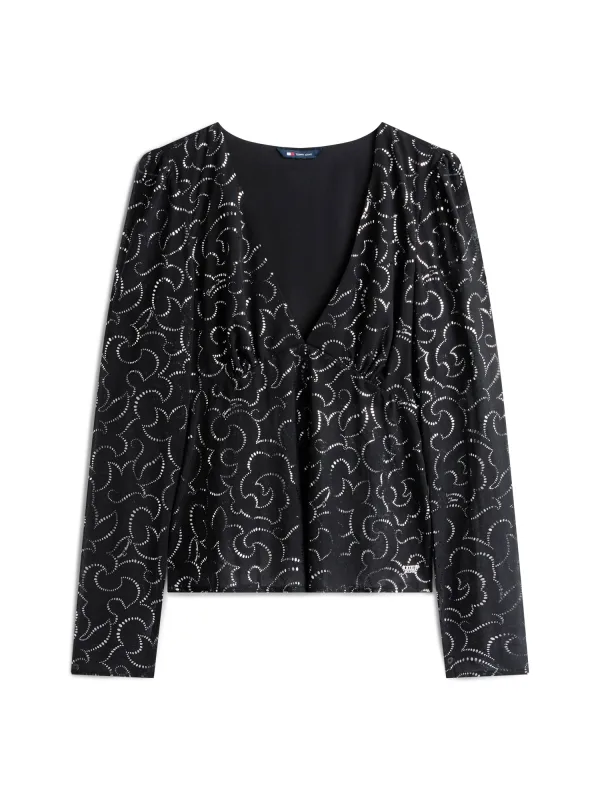 Blouse type: Klassieke blouse; Design: Gevoerde zoom/rand, Diepe snit/decolleté; Materiaal: Gerecycled materiaal; Kraag: Zonder kraag; Extra's: Licht transparant, All-over patroon; Pasvorm: Losse pasvorm; Armlengte: Lange mouw; Lengte: Normale lengte
