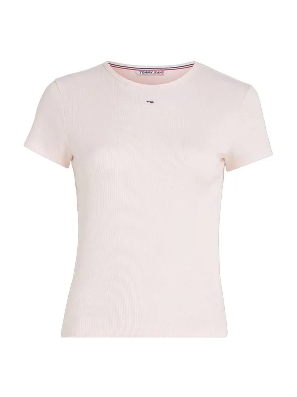 Tommy Jeans Essential Cot dames T-shirt van roze katoen. Authentiek Tommy Jeans merkkledingstuk - streetwear/sportkleding design van Tommy Jeans - Tommy Jeans voor dames, modieus en perfect voor dagelijks gebruik - dit roze Tommy Jeans T-shirt is een perfecte aanvulling op je garderobe - comfortabele katoenkwaliteit - klassieke Essential Cot -