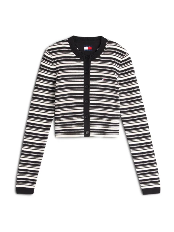 Design: Geribbelde kraag, Rechte zoom, Knop placket, Geribd ceintuurtje; Type sluiting: Knoopsluiting; Materiaal: Knitwear; Halstype: Ronde hals; Motief: Gestreept; Details: Borduursels; Extra's: All-over patroon, Fully fashioned, Label borduurwerk; Pasvorm: Slanke pasvorm; Armlengte: Lange mouw; Lengte: Normale lengte