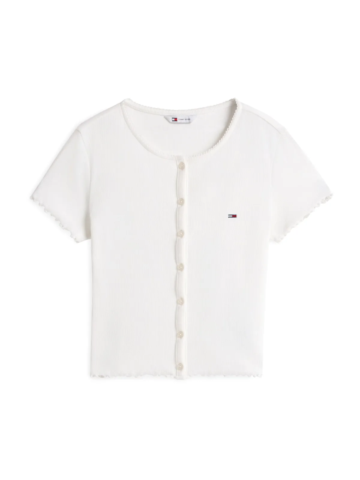 T-shirt voor dames van Tommy Jeans;Look: effen;Pasvorm: Slim fit;Applicatie: Gestikt logo;Hals: Boothals;Mouwvorm: korte mouwen;Mouwboord: Volant;Rompzoom: Volant;Materiaalverwerking: RIB;Materiaal: Katoenmix