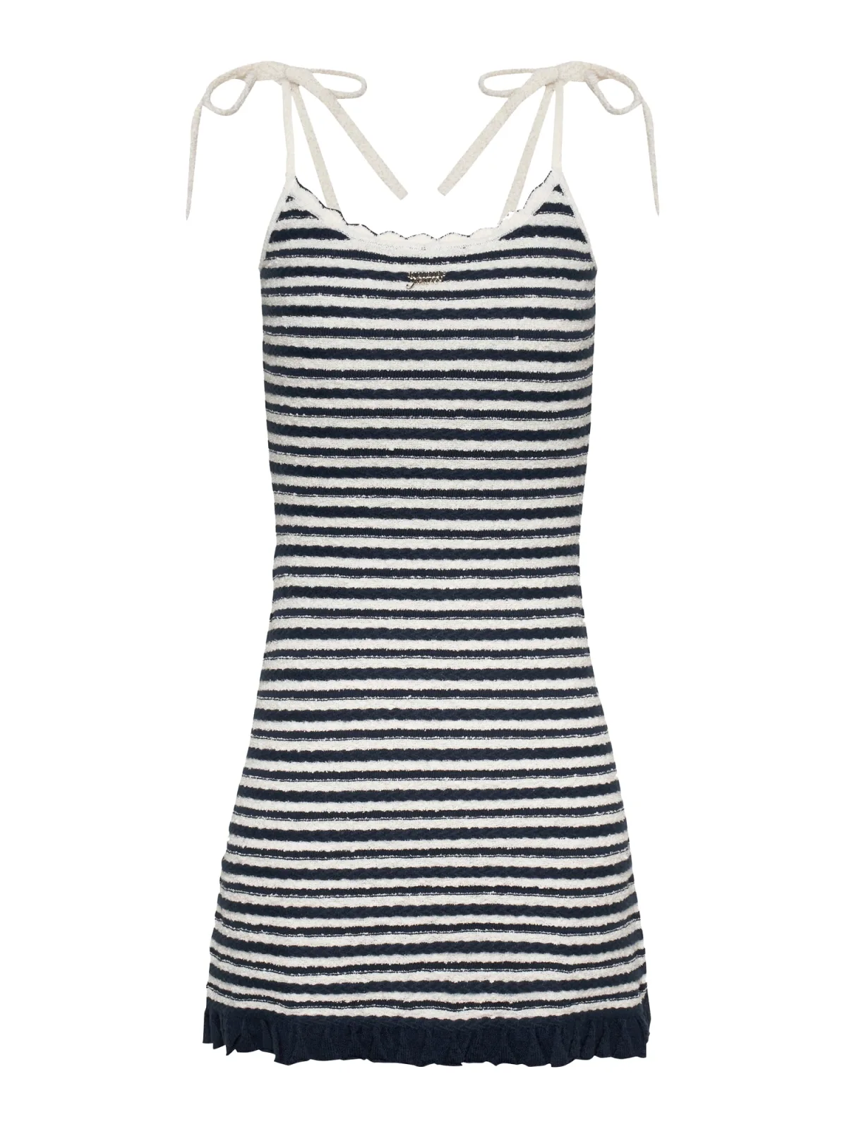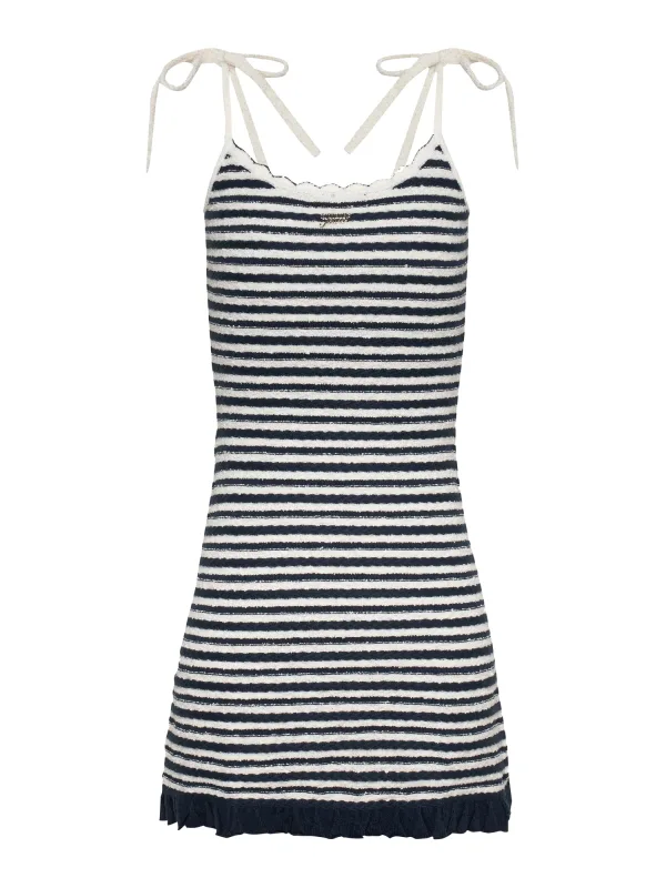 Design: Geribd ceintuurtje, Om te knopen/binden; Materiaal: Knitwear; Halstype: Boothals; Motief: Gestreept; Soort bandjes: Spaghettibandjes; Details: Volant; Extra's: Label plaatje, All-over patroon, Voelt zacht aan; Lengte: Kort/mini; Snit: Getailleerd; Pasvorm: Slanke pasvorm; Armlengte: Mouwloos