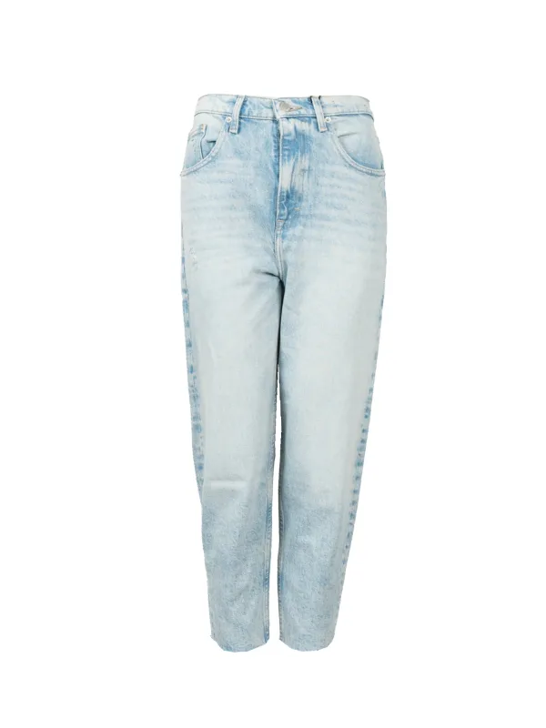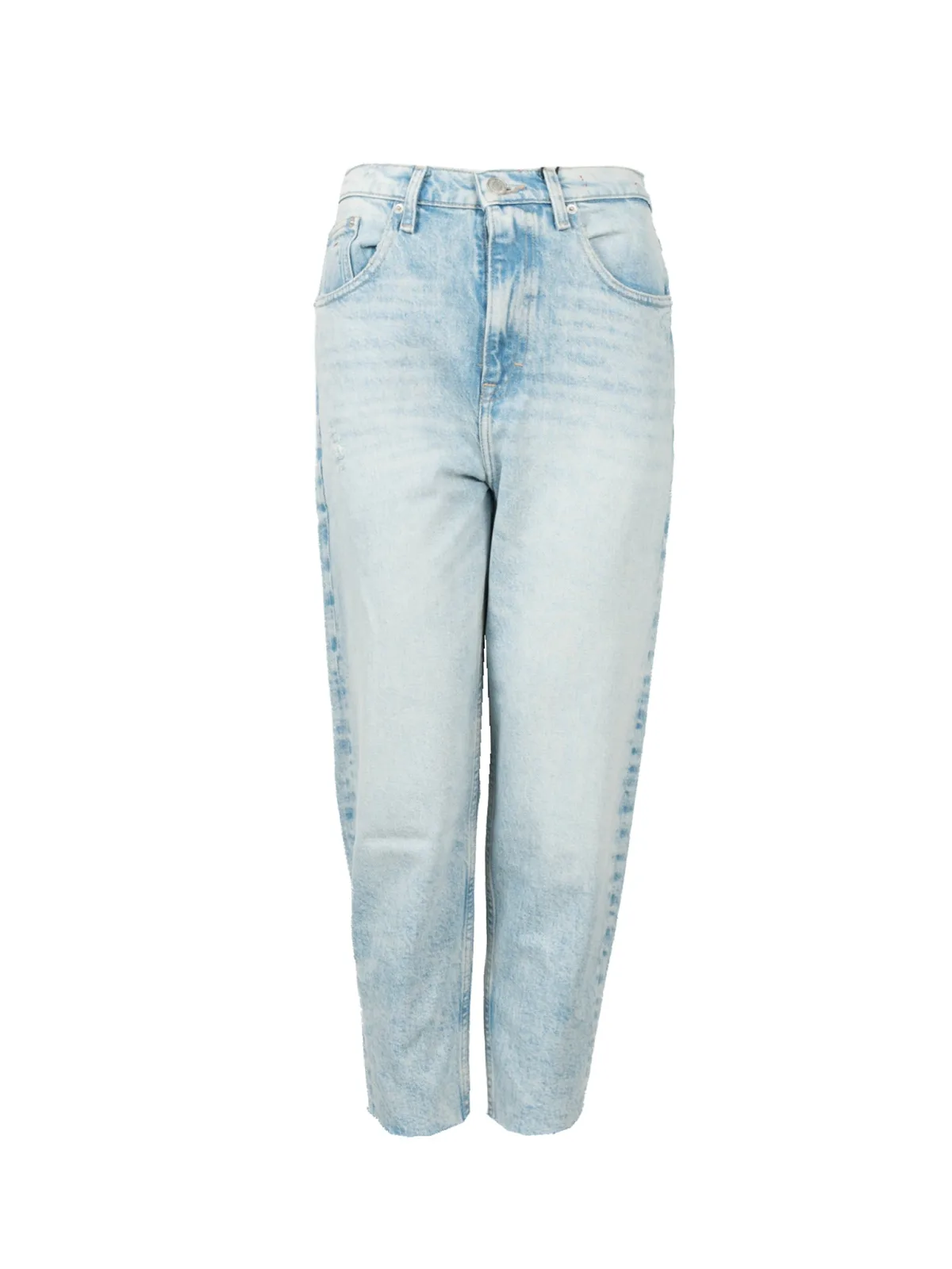 Nauwsluitend model Zeer hoge taille 7/8 beenlengte Met gebruikt effect en slijtplekken Sluit met een rits en een gemarkeerde knoop Drie zakken voor, twee achter Genaaid met gele draad Beenuiteinden met franjes Het merklogo is geborduurd op de rechterzak Een bedrijfspatch op de achterkant Gemaakt van denim van hoge kwaliteit Met een stretchcomponent