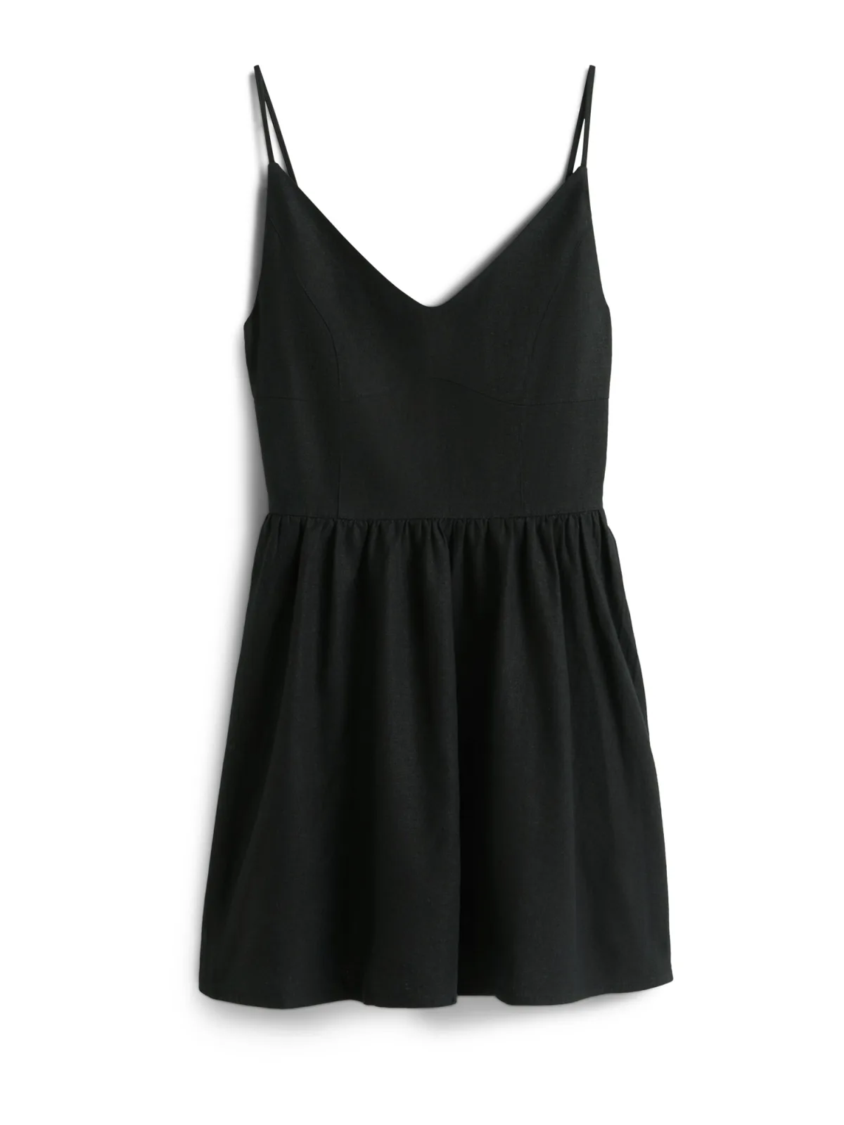 Design: Gevoerde zoom/rand, Zakken aan de zijkant; Materiaal: Linnen; Halstype: V-hals; Motief: Effen; Soort bandjes: Spaghettibandjes; Details: Borduursels, Gedrapeerd; Extra's: Verstelbare bandjes, Op staal naden, Milieuvriendelijk geproduceerd; Lengte: Kort/mini; Snit: Getailleerd; Pasvorm: Normale pasvorm; Armlengte: Mouwloos