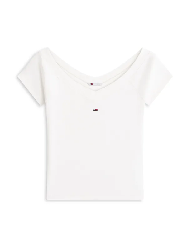 dames T-shirt van Tommy Jeans;look: effen;pasvorm: slim fit;Applicatie: gestikt logo;hals: boothals;Mouwvorm: Off-Shoulder;materiaalverwerking: jersey;Materiaal: katoenmix