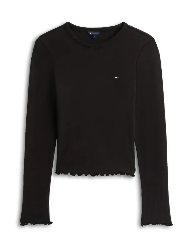 Dames longsleeveshirt van Tommy Jeans;Look: effen / Two Tone;Pasvorm: Slim fit;Patroon: gestreept;Applicatie: Logo-detail;Hals: Ronde hals;Mouwvorm: lange mouw;Mouwboord: Frill;Rompzoom: Ruches;Materiaalverwerking: Fijnrib;Materiaal: Katoenmix