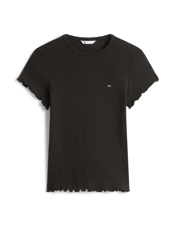 Dames T-shirt van Tommy Hilfiger;Look: effen / gestreept;Pasvorm: Slim fit;Applicatie: Logo-detail;Hals: Ronde hals;Mouwvorm: korte mouw;Mouwboord: Frill;Rompzoom: Ruches;Materiaalverwerking: Fijnrib;Materiaal: Katoenmix