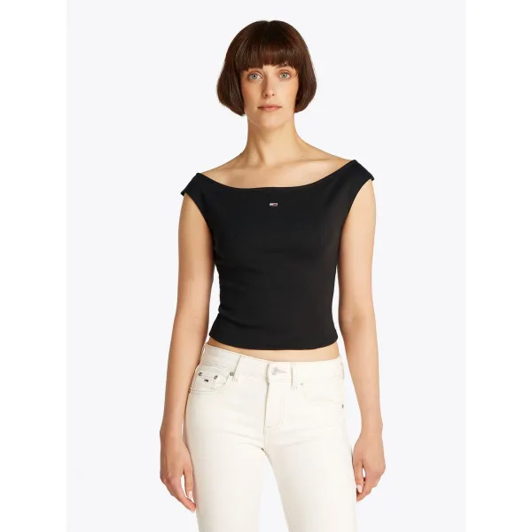 T-shirt voor dames van Tommy Jeans;Look: effen;Pasvorm: Slim fit;Lengte: Kort;Applicatie: Gestikt logo;Hals: Boothals;Mouwvorm: mouwloos;Materiaalverwerking: Jersey;Materiaal: Katoenmix;Ruglengte bij maat S: 42 cm;Borstomvang bij maat S: 36 cm
