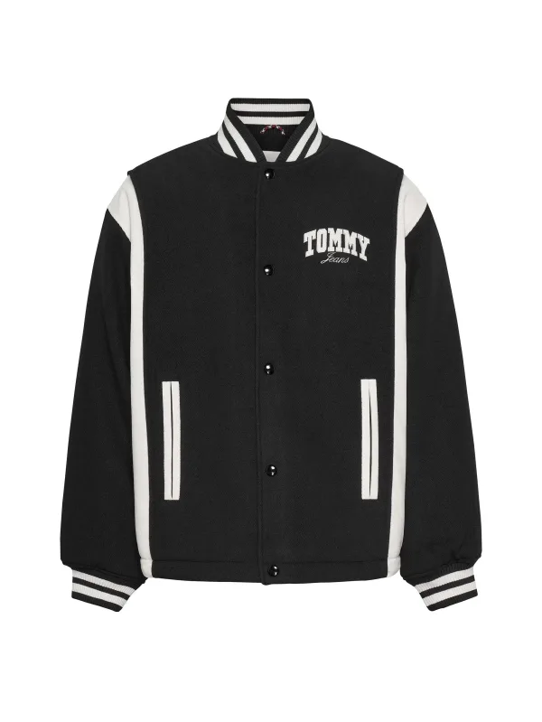 Kleur: Zwart Zwart BDS Mouwen: Lange Halslijn: Met geribde kraag Details: Losvallend jasje dat retro hiphopstijl en college-geïnspireerde esthetiek combineert, dankzij de contrasterende strepen gecombineerd met het logo, gekenmerkt door twee paspelzakken aan de zijkanten, aan de binnenkant Paspelzak, gewatteerde voering en Tommy Jeans-logo op de borst Lengte: Regular Fit: Oversize Sluiting: Drukknopen Gelegenheid: Herfstseizoen