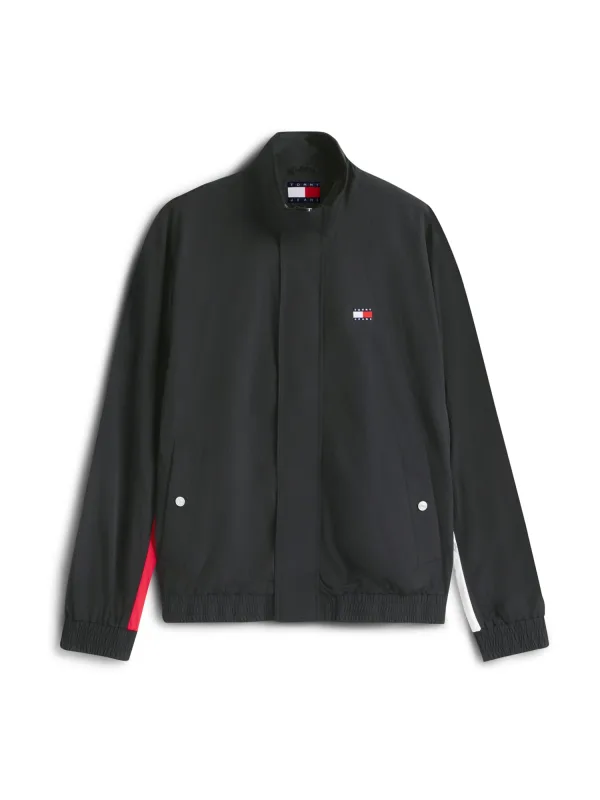 heren blouson van Tommy Hilfiger;look: effen;Pasvorm: regular fit;kraagmodel: opstaande kraag;Sluiting: verdekte drukknoopsluiting met ritssluiting;Applicatie: logo-applicatie, logostitching;Mouwvorm: lange mouw;mouwboord: elastisch;rompzoom: elastisch;Zakken: zij- steekzakken met drukknoop;materiaalverwerking: satijn