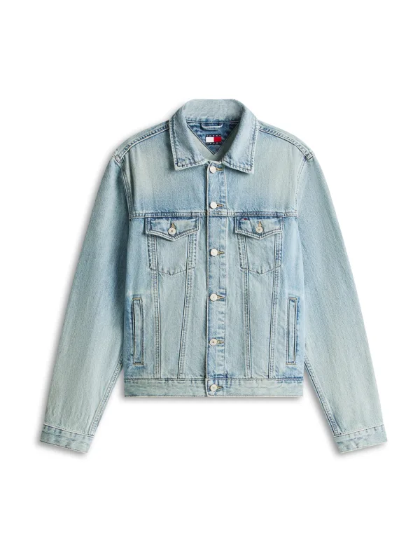 Heren jeansjack van Tommy Jeans;look: denim;Pasvorm: regular fit;kraagmodel: platte kraag;Sluiting: enkelrijige knoopsluiting;Applicatie: labelpatch;Mouwvorm: lange mouw;Zakken: borstzakken;Materiaal: puur katoen