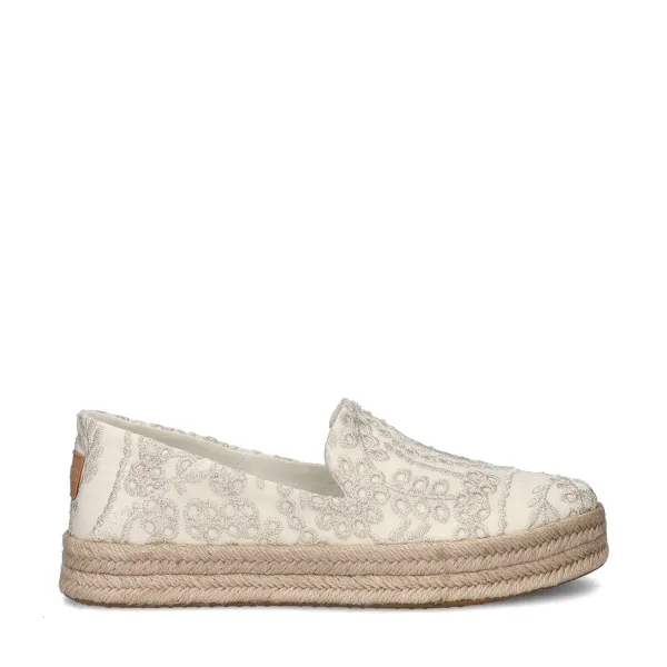TOMS Carolina dames espadrille De espadrilles van TOMS zijn al jarenlang favoriet. Deze leuke variant met broderie past helemaal bij een feestoutfit, bijvoorbeeld voor een zomer bruiloft. Uitgevoerd in textiel met glitterdraad. Het motief zorgt voor een leuke kruising tussen casual en feestelijk. Gevoerd met zacht textiel. Dit zorgt voor een fijn draaggevoel tijdens het lopen. Voorzien van een OrthoLite-voetbed. Deze garandeert langdurige demping en een goede doorademing gedurende de hele dag. Afgewerkt met een rubberen loopzool. De tussenzool is zomers afgewerkt met touw.