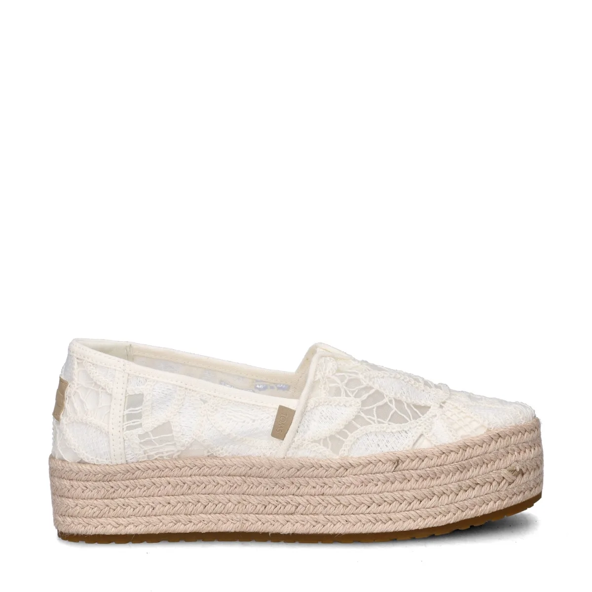 Toms Valencia dames espadrille Een espadrille moet iedere vrouw in de collectie hebben. En Toms blinkt dan natuurlijk uit! Uitgevoerd in linnen met metallic draad voor een subtiele glitter. Het opengewerkte patroon zorgt voor een betere doorademing. Gevoerd met canvas wat een fijne verkoelende werking heeft op warme dagen. Voorzien van een OrthoLite® EcoLT-Hybrid-voetbed. Deze is onder andere gemaakt van milievriendelijke materialen en gerecycled rubber en biedt goede demping bij iedere stap. Afgewerkt met een plateauzool met touwafwerking wat de espadrille die echte summer feels geeft.