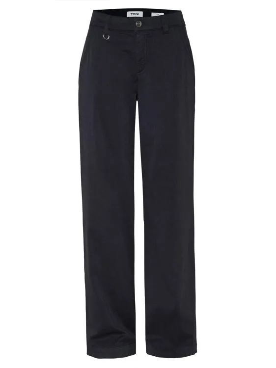 Deze effen, donkergekleurde pantalon van TONI heeft een rechte, comfortabele snit. De tailleband is voorzien van riemlussen, een knoop- & ritssluiting en een subtiele metalen D-ring aan de voorkant. Voorzien van nette steekzakken; de pijpen vallen soepel voor een elegante lijn. De kwaliteit voelt zacht en stevig aan, ideaal voor dagelijks gebruik. Categorie: Dames, Broeken; geslacht: Dames.