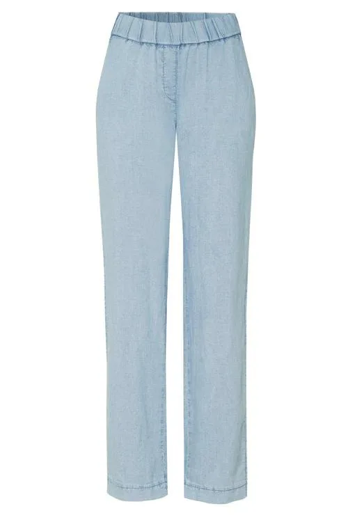 Deze TONI pantalon heeft een soepele denimlook in lichtblauw met een rechte pijp. De comfortabele, brede elastische tailleband zorgt voor een nette instap zonder zichtbare rits of knoop, terwijl de siergulp en twee steekzakken een clean silhouet geven. Het weefsel voelt licht en soepel aan, ideaal voor dagelijks dragen. Afgewerkt zonder opvallende logo’s of dessin zodat je de jeansachtige broek makkelijk combineert. Te koop via de webshop of in de winkel bij Steegenga Mode in Friesland.