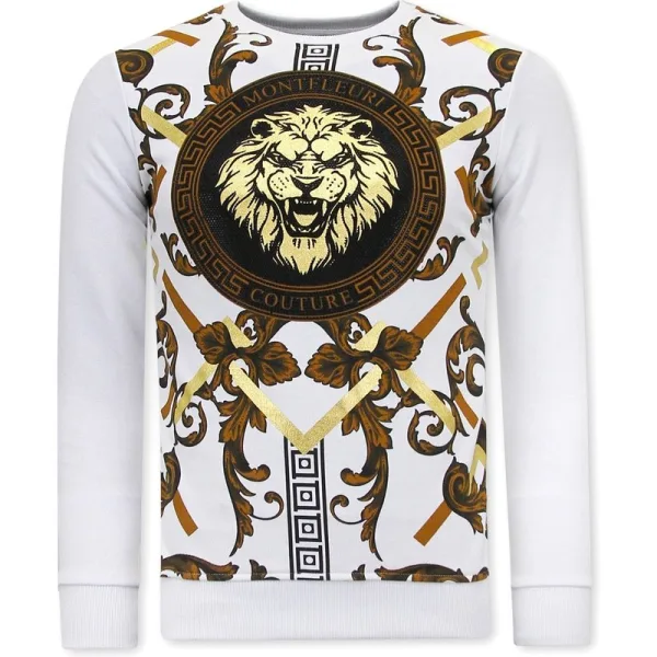 Heren Sweater met Print - Gouden Leeuw - 3728 - Wit - Specificaties:- Heren Sweater met Print - Gouden Leeuw- Artikelcode:3728-Wit- Kleur: Wit- Seizoen: Voorjaar / Najaar- Kraag: Ronde Kraag- Mouwen: Lange Mouw- Patroon: Print, Rhinestone- Kwalitatief: Hoogwaardige Afwerking- Materiaal: 84% Katoen en 16% Lycra- Weefsel: Geweven- Pasvorm: Getailleerd Italiaans- Wasvoorschrift: Handwas, Binnenste buiten wassen (Niet in de droger)- Beschikbare maten: S - M - L - XL - XXL