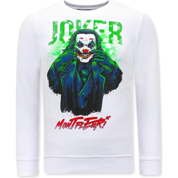 Heren Sweater met Print - Joker - 3762 - Wit - Specificaties:- Heren Sweater met Print - Joker - Artikelcode:3762-Wit- Kleur: Wit- Seizoen: Voorjaar / Najaar- Kraag: Ronde Kraag- Mouwen: Lange Mouw- Patroon: Print, Rhinestone- Kwalitatief: Hoogwaardige Afwerking- Materiaal: 84% Katoen en 16% Lycra- Weefsel: Geweven- Pasvorm: Getailleerd Italiaans- Wasvoorschrift: Handwas, Binnenste buiten wassen (Niet in de droger)- Beschikbare maten: S - M - L - XL - XXL